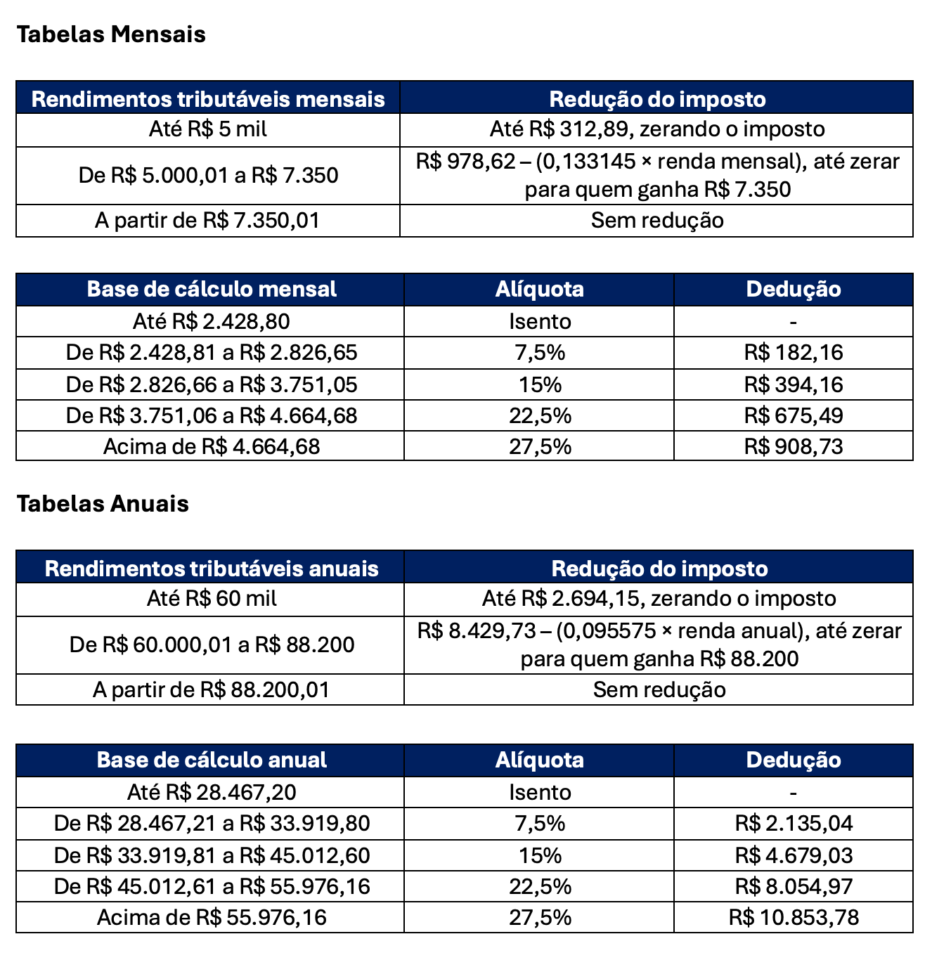 A tabela progressiva tradicional foi mantida, no entanto, foram realizados ajustes para viabilizar a ampliação da faixa de isenção com a criação de novas tabelas de dedução, que serão aplicadas de forma simultânea à tabela tradicional, conforme abaixo: