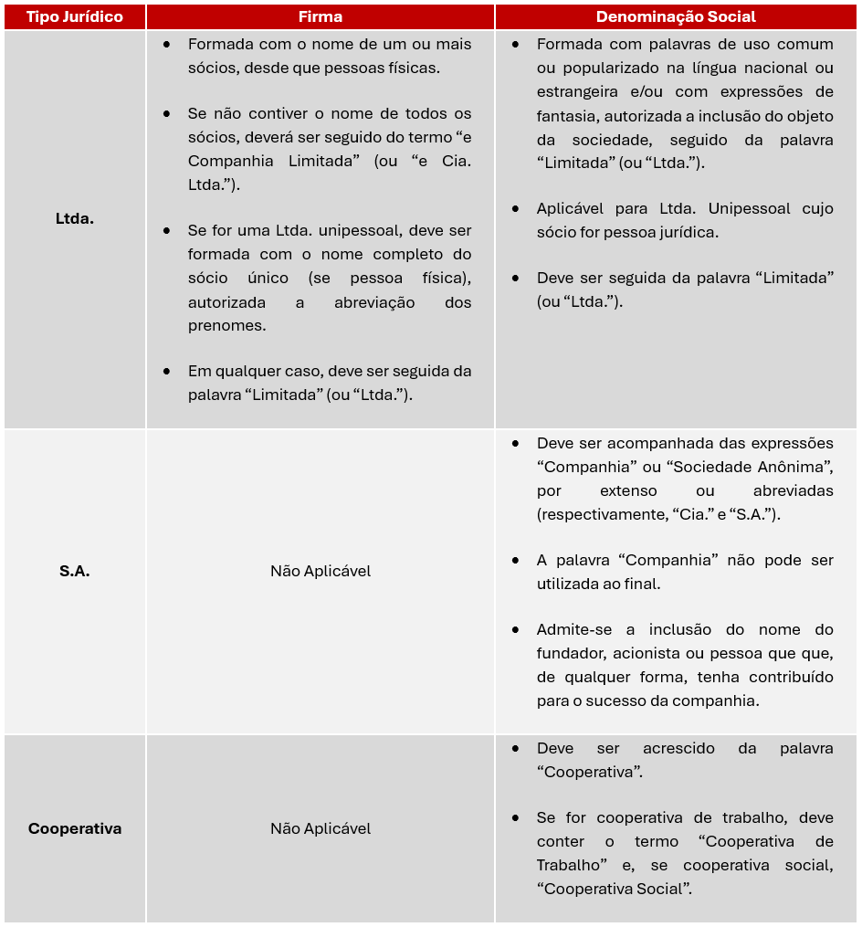 A seguir, destacam-se as regras para formação do nome empresarial de sociedades limitadas (“Ltda.”), aí incluídas as limitadas unipessoais (“Ltda. Unipessoal”), sociedades por ações (“S.A.”) e cooperativas, das quais as duas primeiras são amplamente adotadas para o desenvolvimento de atividades econômicas organizadas: