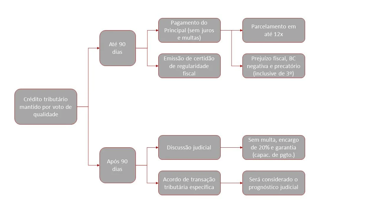Em contrapartida, é positiva a previsão de que, em caso de decisão favorável à Fazenda Nacional por voto de qualidade, serão excluídas as multas e cancelada a representação fiscal para fins penais (RFFP), bem como a inscrição em dívida ativa não incluirá o encargo de 20%.